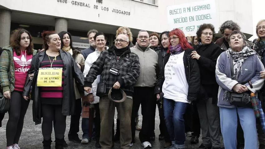 Concentración de SOS Bebés Robados a las puertas de los jugados de Plaza de Castilla, en Madrid.