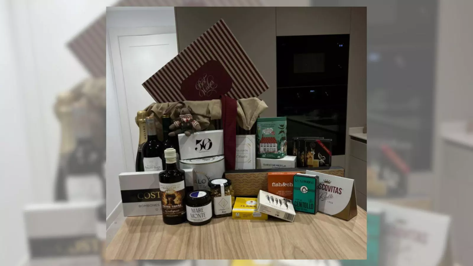En una elegante caja a rayas beis y granate en la que se puede leer "Best Wishes" (mejores deseos) se esconden todas estos productos de las mejores marcas locales. Ha sido la usuaria de TikTok Clau Fernández (@clott12), la que ha compartido en sus redes el contenido de la cesta de estas navidades.