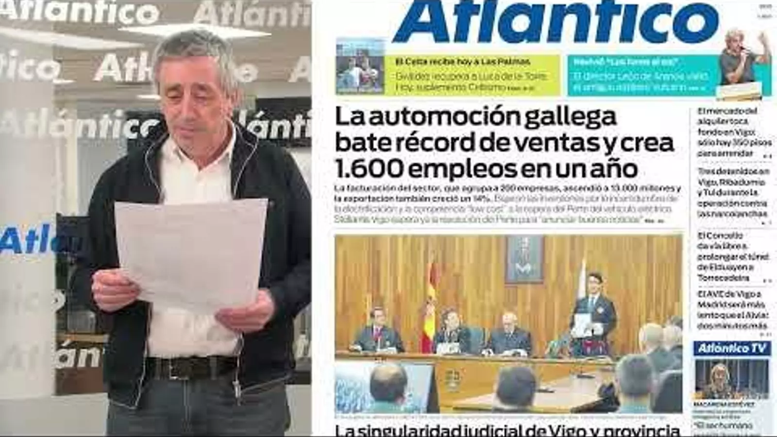 La automoción gallega bate récord de ventas y crea 1.600 empleos en un año abre la portada de Atlántico del sábado 20 de abril. La otra información destacada es para la singularidad judicial de Vigo y provincia, el fiscal general del Estado, García Ortiz, puso al Ministerio Público vigués como ejemplo de gestión de un mapa “complicado” y animó al nuevo jefe del área, Óscar Vallejo, a mantener la colaboración.