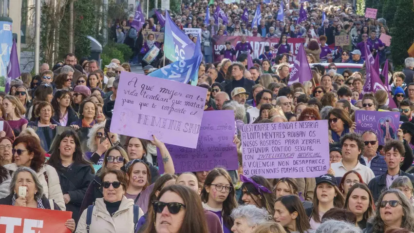 La más numerosa, con unos 10.000 participantes según cifras de la Policía Local, transcurrió por la tarde desde la Praza de España (Praza dos Cavalos, como figuraba en la convocatoria) hasta el final de Policarpo Sanz, organizada por la plataforma Resposta Feminista-As que miran lilá", que aglutina a distintas asociaciones y entidades feministas. En ella participaron también sindicatos como CCOO y CGT, organizaciones políticas como BNG, Galiza Nova, Sumar y EU y colectivos LGTBIQ+.