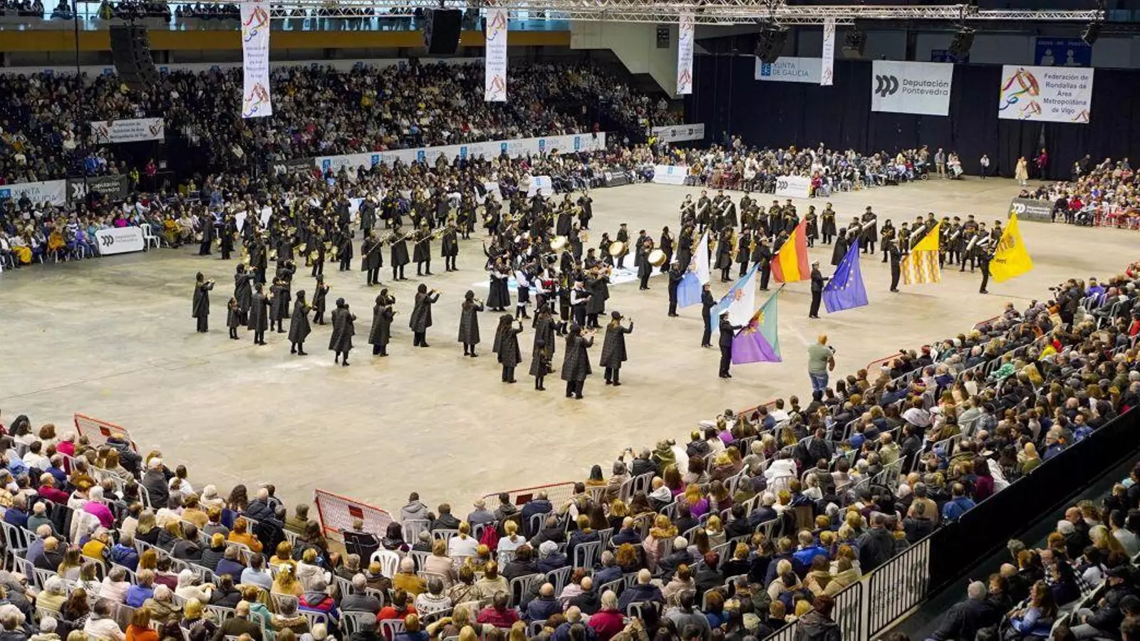 Gaitas, panderetas, castañuelas y conchas de vieira. Todo servía para marcar el ritmo. Algunas agrupaciones quisieron apartar un poco la tradición para introducir un estilo más rockero y otras, fiel a su estilo, tiraron del pasodoble para engatusar al jurado, que no solo valoró la música, sino también otros aspectos como la coordinación entre los abanderados, los movimientos por el espacio y la animación que generaba en el público. No se lo quiso perder el conselleiro de Cultura, José López Campos, ni la vicepresidenta de la Diputación, Luisa Sánchez. “Es un legado inmaterial tan valioso”, indicó López Campos. Sánchez recalcó el récord de público y el “talento y amor” de los más de 1.700 rondalleiros que salieron al escenario.