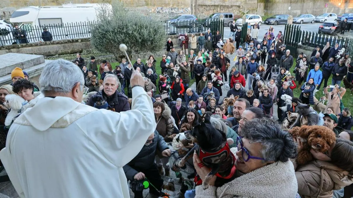 Una fiesta religiosa para perros y gatos. Ayer, la Parroquia de la Soledad celebró su tradicional bendición de mascotas por San Antón, protector de los animales. Y allí se acercaron más de cincuenta canes, algún felino y una cobaya, que también quería recibir su bendición. Entre ladridos y maullidos, el padre Alberto Cuevas roció con agua bendita sus pieles y les protegió de todo lo malo. Aunque algunos no se lo tomaron muy bien en ese instante.