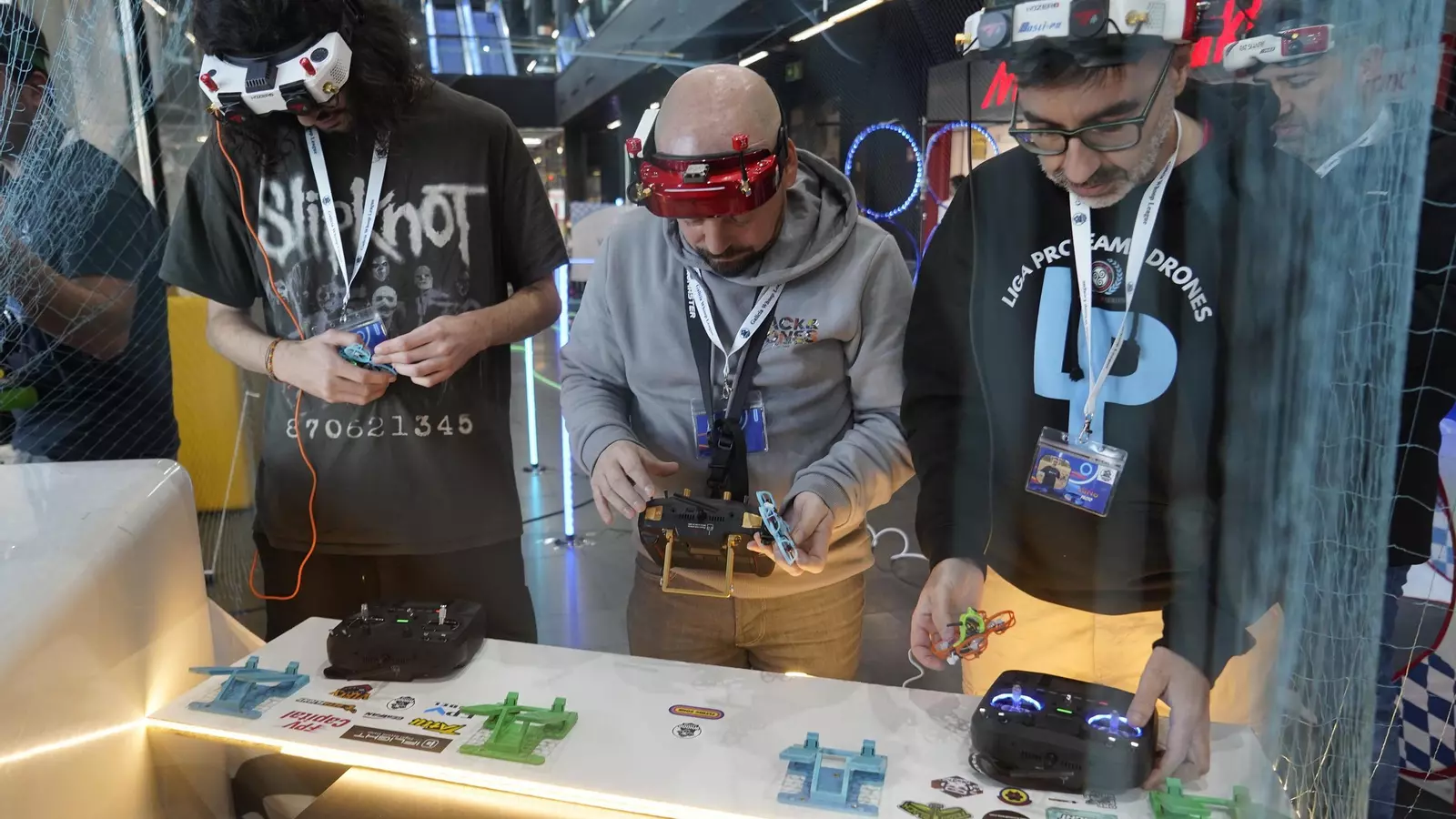 Según explican los participantes, cualquiera puede empezar en este ‘hobby’ –particularmente el que implica estos drones tan pequeños– invirtiendo unos 200 euros, gafas y emisora –se controlan por radiofrecuencia– incluidas. En esta competición, hasta cuatro pilotos a manejan sus drones a la vez dentro del circuito, que deberán completar en el menor tiempo posible para avanzar. Como las dimensiones de esta instalación ‘indoor’ no son muy grandes, se trata de un desafío más de técnica que de velocidad. Pero con las máquinas más potentes, “podemos alcanzar velocidades de hasta 250 kilómetros por hora”, añade uno de los competidores.