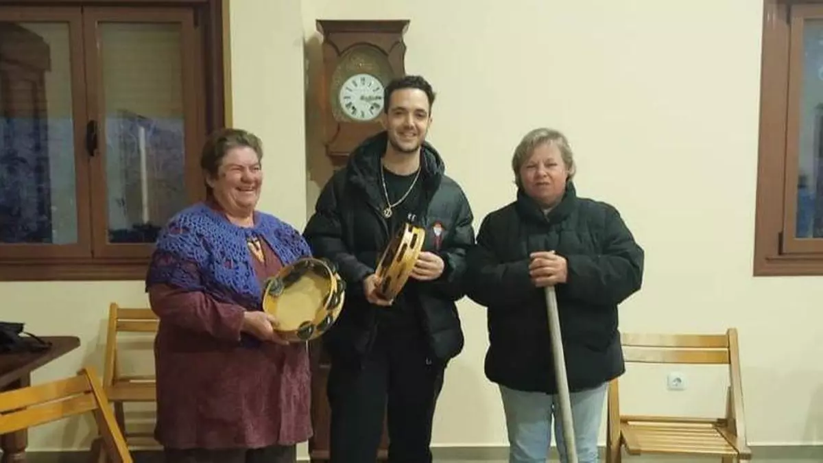 El artista madrileño, hijo de un vigués celtista, se ha interesado sobre todo por la pandereta. Así, compartió una jornada de aprendizaje con las Pandereteiras de Toutón, en Mondariz, que destacaron la simpatía del joven y aseguraron que fue "todo un privilegio" conocerle.