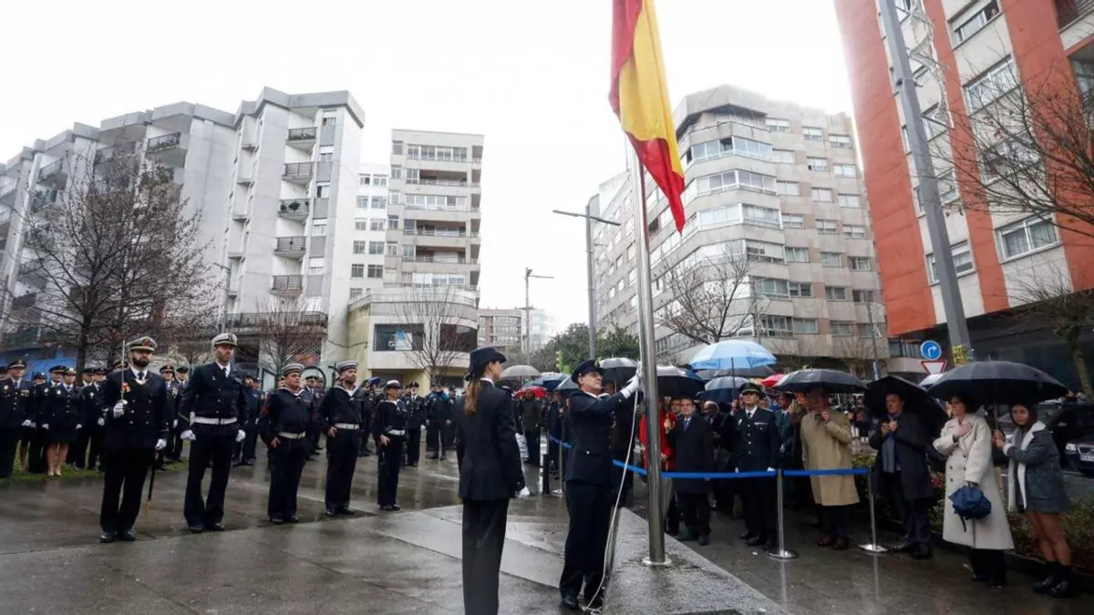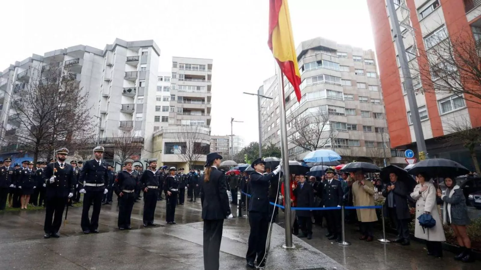 El acto por el bicentenario del cuerpo de seguridad comenzó con el izado de la bandera española. Todo ello bajo un complicado aguacero, que no impidió que el estandarte luciese delante de la comisaría. Curiosos se agolparon para observar el acto, acompañado del himno de España, interpretado por la banda de música del cuerpo. Allí estaban presentes autoridades como el propio alcalde, la concejal de Seguridad Patricia Rodríguez, la vicepresidenta de la Diputación Marta Fernández-Tapias, la delegada de la Xunta Ana Ortiz o el presidente del Puerto Carlos Botana.