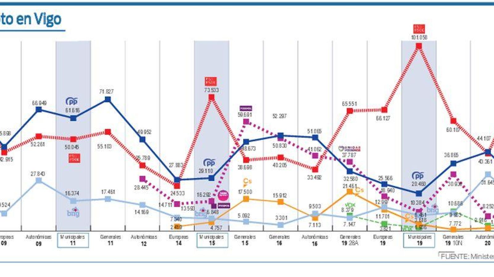 Desde las generales de 2008 con Zapatero, no ha habido otro político que haya conseguido unos resultados similares a los de Caballero en Vigo, que también ayer superó con 82.313 las cifras de apoyo socialista de aquellos comicios, cuando se alcanzaron los 78.065. Los populares, por su parte, lograron recuperarse ligeramente, con 5.000 votos más (pero 18.000 menos que en las autonómicas), y el BNG, que obtuvo sus mejores registros desde 2015 está lejos todavía de los más de 39.000 que llegó a tener con el gobierno de Lois Pérez Castrillo. Marea, en su coalición con Podemos, ha sido el gran damnificado de estas elecciones, al perder la representación que había conseguido tras irrumpir hace dos mandatos en el Concello e ir perdiendo fuelle. Se cae de la política municipal y cogen el relevo los nacionalistas tras quedar descolgados hace ocho años: suman tres concejales.