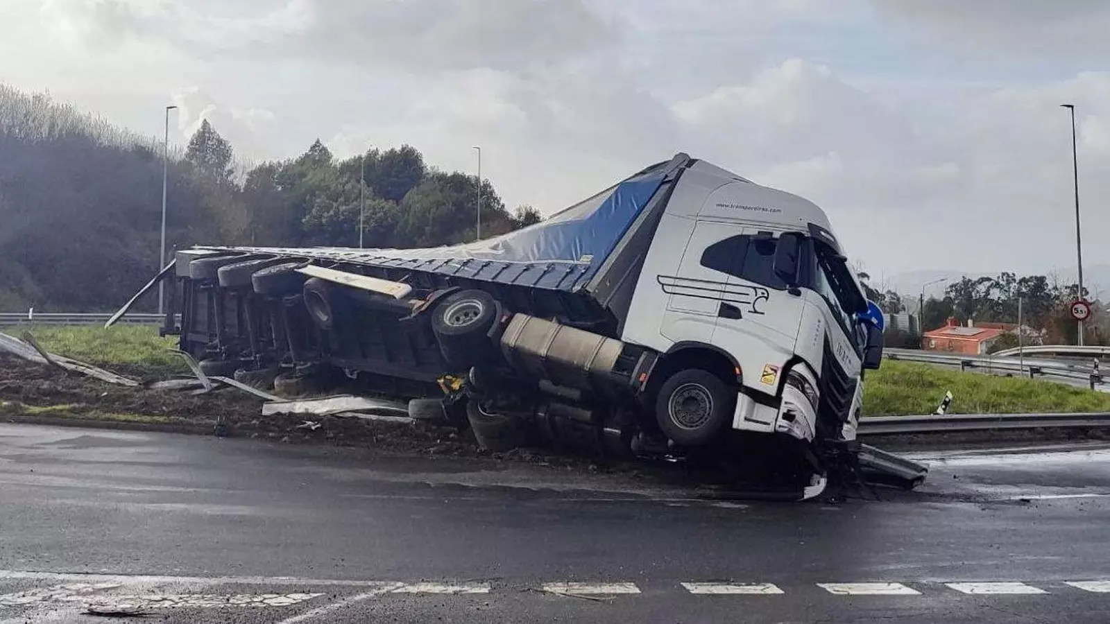 Un camión de transporte de piezas se sale de la vía en San Andrés de Comesaña