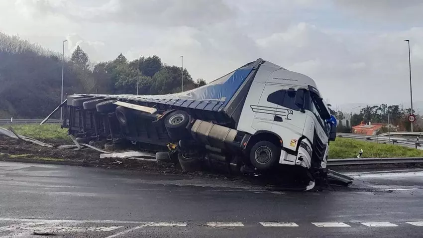 Un camión que transportaba piezas sufrió a primera hora de esta tarde un aparatoso accidente que se ha saldado sin heridos.
