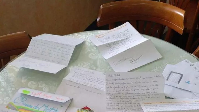 El hotel O Cruceiro do Monte recibió ayer todas estas cartas de alumnos de un colegio próximo dando las gracias a su propietaria por acoger a las personas afectadas por la explosión de Tui. Los alumnos cuentan que su profesor escuchó en la radio el gesto de la propietaria y le escribieron todas estas misivas.