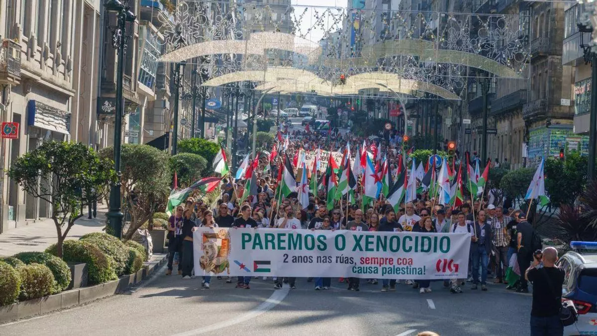 La movilización por Palestina convocada en toda España tuvo su reflejo en Vigo, con paros de dos horas (convocados por UGT y CC.OO.), pasando por cuatro horas (CIG) hasta huelga general todo el día (CGT y CUT, entre otros).