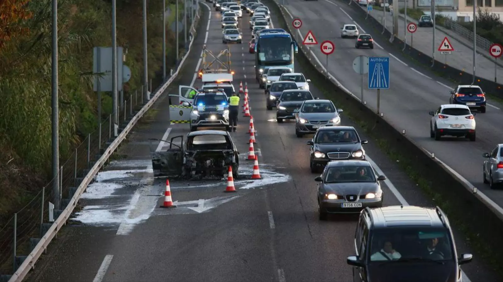 El incidente obligó a cortar durante unos 45 minutos la autovía. El turismo acabó calcinado pero no hubo heridos