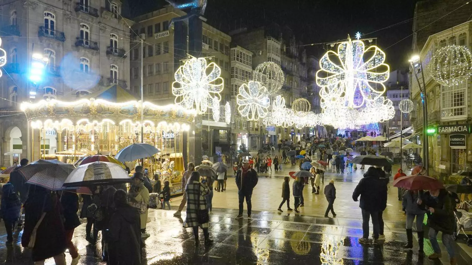 Vigo superó ayer su prueba de fuego, tras el éxito, el sábado, del encendido de las luces, que llegó a congregar en el centro de la ciudad a más de 45.000 personas. El domingo fueron muchas menos, pero suficientes para ver de nuevo una Porta do Sol cubierta de paraguas que esperaban su turno para hacerse selfis ante las principales atracciones, como el Abeto, la Noria o la Carroza.