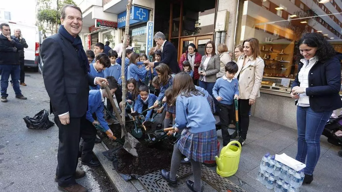 Caballero con alumnos del colegio Alba plantando olivos en el Día del Árbol.