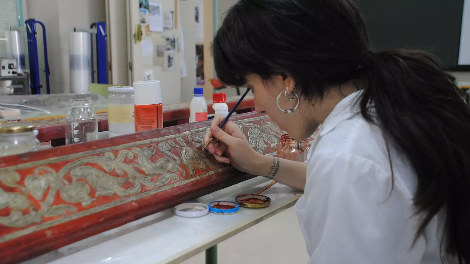 Los alumnos de la Escola de Conservación y Restauración trabajan sobre piezas patrimoniales reales y por sus manos ya pasaron más de 700 piezas. En la rehabilitación de los listones del Conservatorio intervinieron los alumnos de escultura. Aplicaron limpieza de físico-química, la unión de rotos, la consolidación, el injerto de diferentes piezas, la integración cromática y la protección. Utilizaron técnicas como el cuero repujado, el curtido vegetal, tapizado, plateado, corlado y policromado.