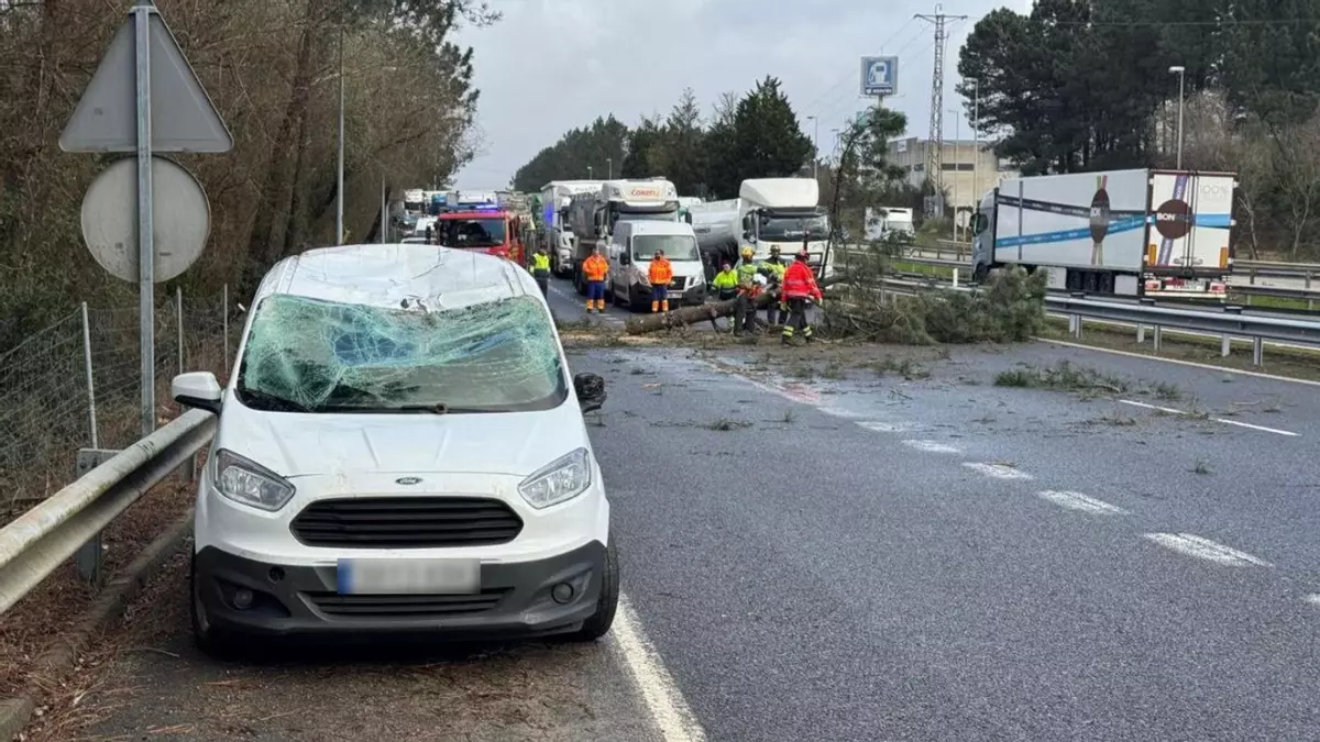 La autovía A-55, en el kilómetro 22 a su paso por Porriño, ha quedado totalmente cortada en sentido Tui tras la caída de un árbol sobre un vehículo. El conductor del coche necesitó asistencia médica en el lugar.