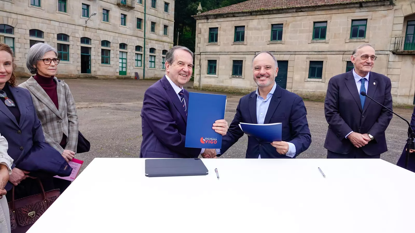 Nuevo paso adelante en la renovación de la ETEA. La antigua escuela militar fue testigo ayer de la firma del convenio, por parte de Zona Franca y Concello –según resaltó el alcalde, el documento ya les llegó firmado por parte de la Xunta–, para la urbanización del PS-1 (la calle que da la Plaza de Armas, esta última incluida), que será asumida por el Gobierno autonómico con un coste de 10,5 millones de euros y la construcción de un aparcamiento subterráneo, que correrá a cargo de Zona Franca bajo desembolso de más de 15 millones de euros.