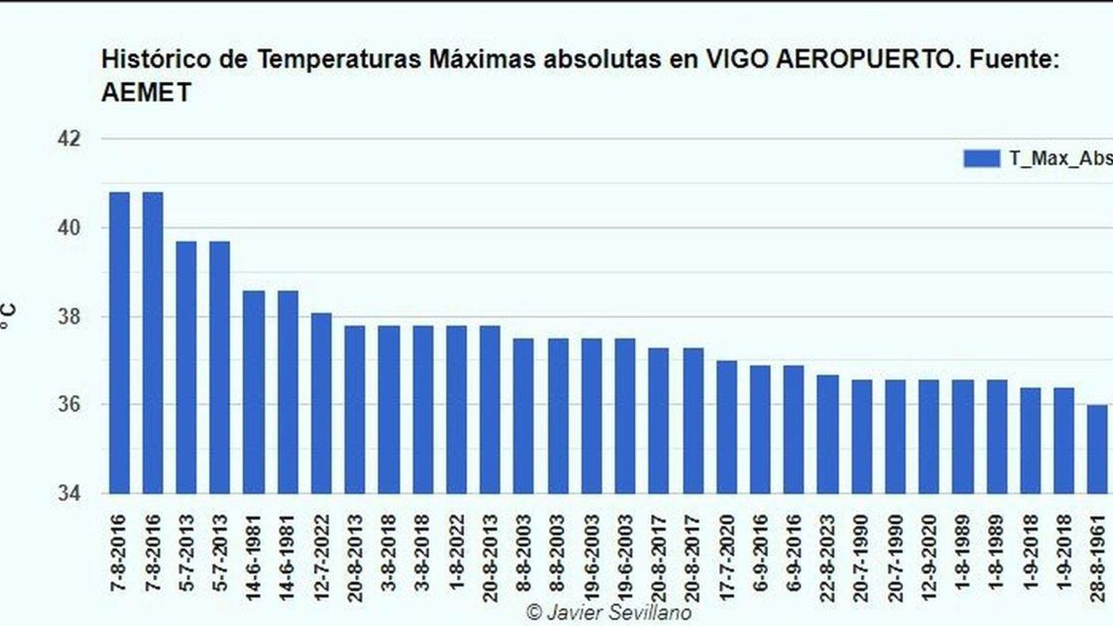 En julio de 2013, la agencia señala que Vigo escaló hasta los 39,7 grados y así aparece en las estadísticas, desbancando a junio del siglo XX. Pero aún hubo otra máxima, que figura en las estadísticas como el récord absoluto: el 7 de agosto de 2016 Vigo superó los 40 grados, y lo hizo en dos ocasiones el mismo día. En concreto, 40,7 grados de máxima en dos momentos de la jornada. Esta plusmarca, sin embargo, no está reconocida por la agencia gallega.