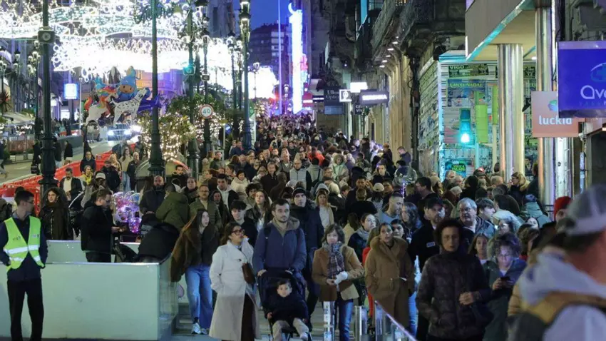 La situación comenzó a complicarse a media tarde. Calles como Areal, García Barbón, Rosalía de Castro o Beiramar se vieron sumidas en el colapso absoluto de tráfico, mientras que a pie, en Gran Vía, Urzaiz, o Príncipe apenas cabía un alfiler.