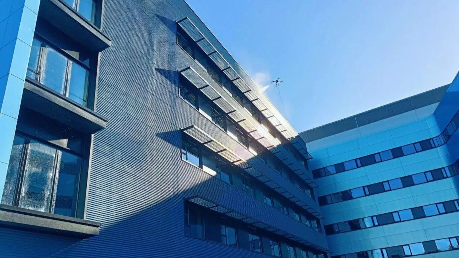 Con una superficie total aproximada de fachada exterior de 84.000 metros cuadrados, hay diferentes tipos de fachadas exteriores: panel minionda, ventilada piedra, panel sandwich, panel composite y muro cortina. El dron tiene un tiempo de vuelo de hasta 24 horas.