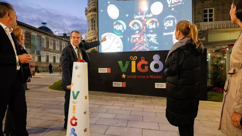 Vigo cuenta ya los días para la Navidad. El alcalde Abel Caballero puso ayer en marcha la pantalla gigante con el reloj instalada en la Farola de Urzaiz que marcará el inicio de estas fechas. Lo hizo al segundo intento, ya que este acto se había previsto ya para este jueves, pero la lluvia obligó a retrasarlo a ayer. Como novedad, este año el reloj incluye la hora de ciudades como de Londres, Nueva York o Tokio con una felicitación navideña alternando entre los distintos idiomas.