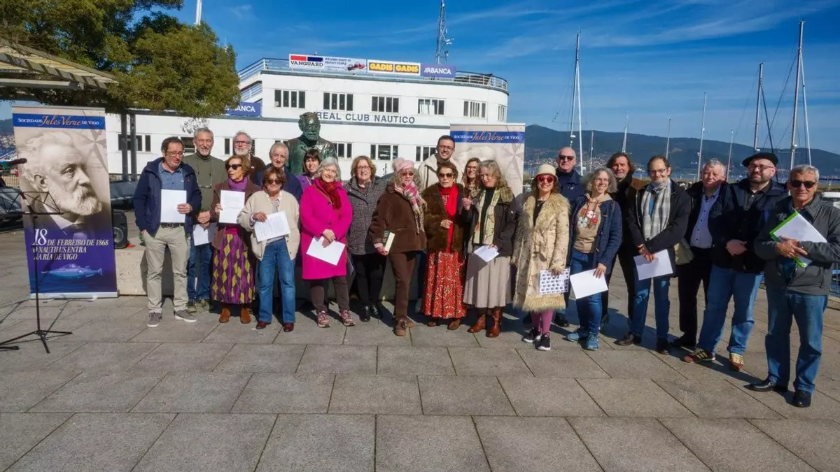 Esta semana, el día 18, se cumplieron 158 años de la llegada a la Ría del submarino “Nautilus” con el capitán Nemo al frente, en busca del oro hundido con los galeones en Rande. Así lo cuenta en todo un capítulo, “En la bahía de Vigo”, la inmortal “20.000 leguas de viaje submarino”, una de las novelas más leídas y traducidas del mundo. Y que colocó a Vigo en el mapa literario, quizá en el mapa a secas. Y todo gracias al gran Julio Verne -aunque ahora se le conoce como Jules, en España siempre se le tradujo el nombre para sentirlo más “de casa”-, quien se comportó como un auténtico vigués en sus dos visitas a la ciudad, en 1878 y 1884, a la que había llegado en su yate “Saint Michel III”. “Participó en la fiesta de la Reconquista y en la procesión del Cristo de la Victoria, solo le faltaba el Celta, pero todavía pasarían algunos años antes de que se fundara”, contaba el presidente de la Asociación Verniana, Eduardo Rolland, en el acto celebrado ayer ante la estatua de Julio (o Jules) Verne en el muelle de las Avenidas, donde como cada año se recordó la imaginaria llegada del más famoso de los sumergibles, con Nemo al frente.