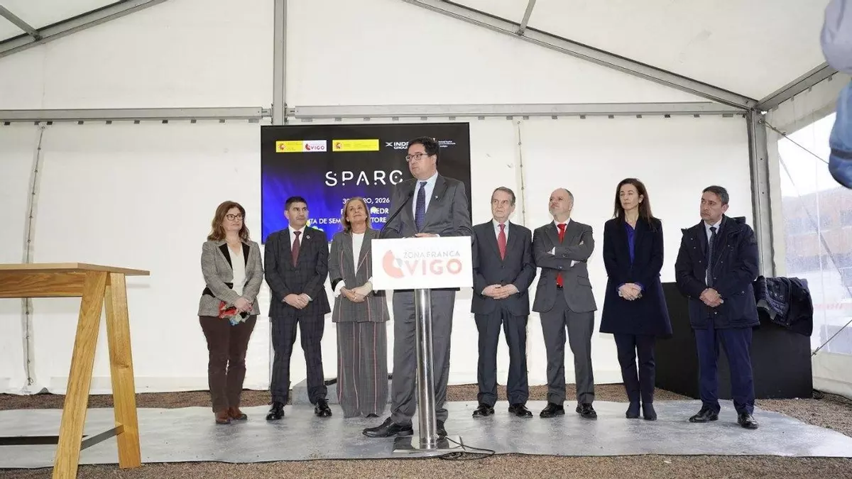 La planta de construcción de microchips fotónicos Sparc empieza a ser una realidad. Esta mañana, en el solar del PTL de Vigo que albergará esta infraestructura de última generación, se celebró el acto simbólico de colocación de la primera piedra. Un evento que el temporal obligó a realizar bajo una carpa gigante y que contó con la presencia del ministro de Transformación Digital, Óscar López; así como del alcalde, Abel Caballero; el delegado del Estado de Zona Franca, David Regades; la teniente de alcalde y senadora Carmela Silva; el CEO de Sparc e investigador de la UVigo, Fran Díaz; y el rector de la Universidad, Manuel Reigosa; entre otros.