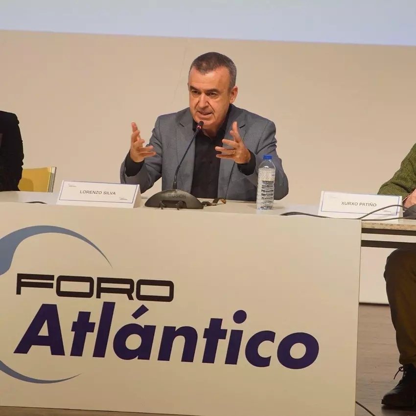 Lorenzo Silva junto a Ana Fuentes, redactora jefe de Atlántico y Xurxo Patiño, de Librouro, en el Foro Atlántico.