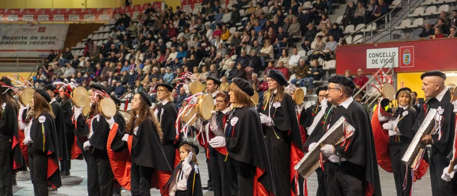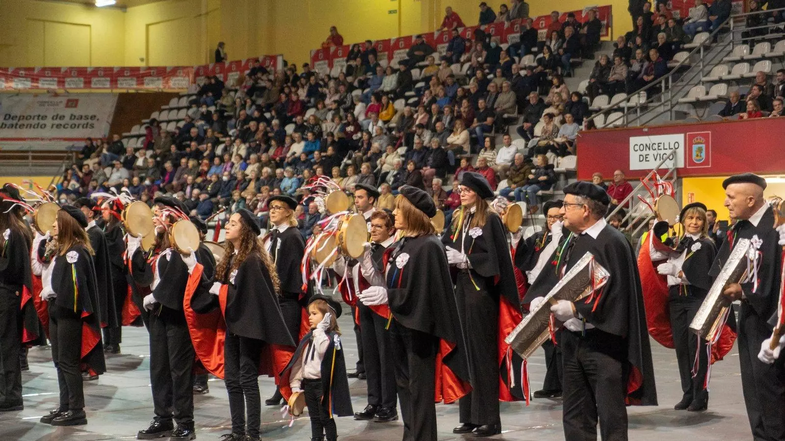 El sonido de las panderetas, los bombos, las trompetas y las gaitas llenó ayer el pabellón de As Travesas de la mano de los más de 600 rondalleiros vigueses que participaron en la quinta edición del certamen organizado por el Concello