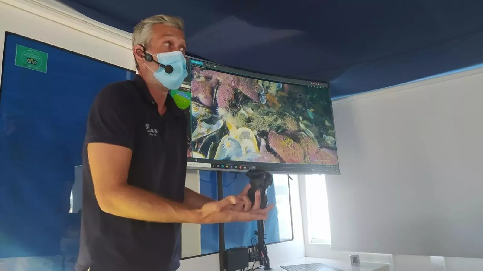 El recorrido de interpretación ambiental comienza haciendo referencia al monumento de Julio Verne que los viajeros contemplan mientras la embarcación zarpa del Real Club Náutico de Vigo. El polígono de bateas es la primera parada que deja a los visitantes asombrados, pues de la mano de Andrés Blanco, que se encarga de la parte explicativa de la actividad y de manejar el ROV, los viajeros comprueban la gran cantidad de especies animales y vegetales que conviven con los mejillones como las anémonas, que aunque son perjudiciales para el cultivo están presentes en las bateas y no hay manera de erradicarlas.