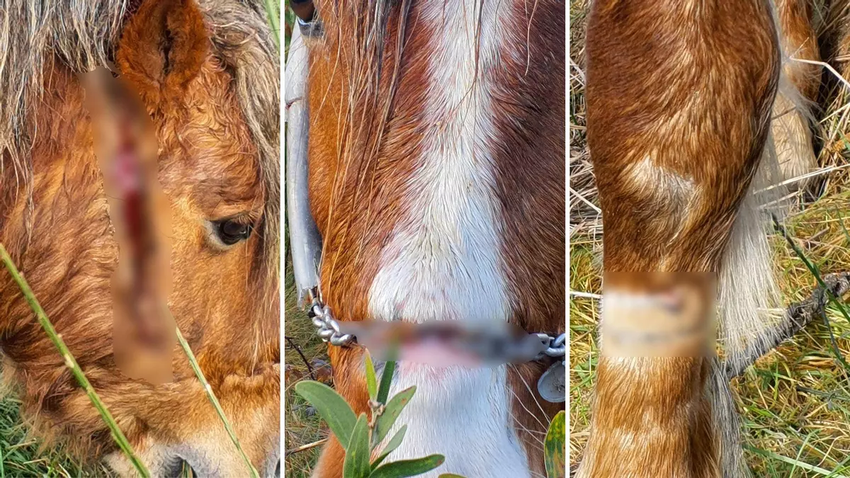 Sin embargo, el segundo equino, localizado en una parcela contigua, se encontraba atado con una cuerda y un cabezal de cadena metálica incrustado en la cabeza y en el hocico, provocándole heridas abiertas y de cierta profundidad. Las lesiones más graves se situaban en la nuca y la parte superior del hocico, aunque toda la zona en contacto con la cadena presentaba un estado alarmante, ya que el metal se había ido enterrando progresivamente en la carne del animal.