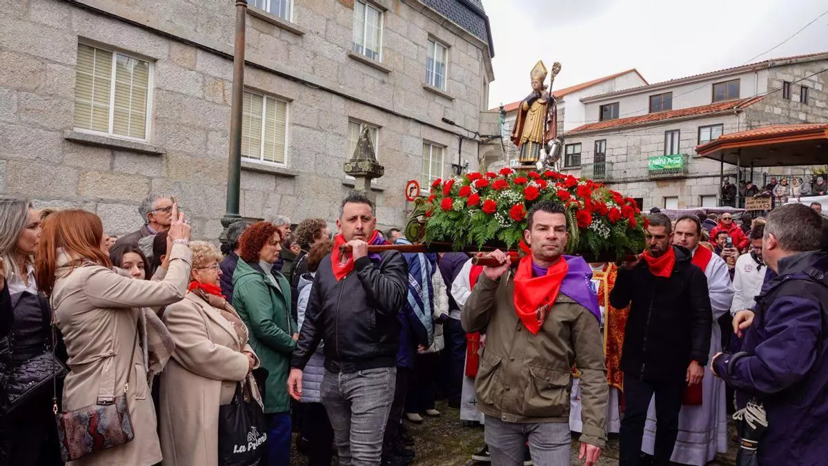 Los portadores fueron por segundo año los integrantes de la peña “A bodega”, que según explicó Miguel, uno de sus integrantes, relevaron en el puesto a los mayores de la parroquia para dar continuidad a la tradición. La procesión salió sin ningún tipo de complicaciones, ya que el tiempo respetó a los devotos. Primero salió Santiago “matamoros”, patrón de la parroquia, y a continuación, San Blas, acompañados de las campanas a toque de arrebato y la música de la banda. Las imágenes rodearon la iglesia para dirigirse a la Praza do Calvario y regresar al templo.