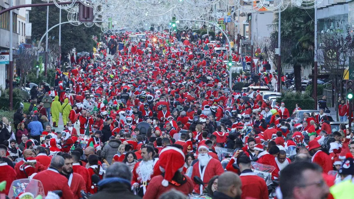 Papá Noel acudió a su cita con Vigo en la pasada noche del 24 de diciembre, pero aún tenía pendiente su tradicional recorrido en moto, que celebró ayer, sábado, tras ser aplazada hace una semana por la lluvia. Esta Papanoelada Motera es una de las más multitudinarias que se recuerdan, con miles de motos participantes, con pilotos y acompañantes vestidos de Santa Claus o Mamá Noel, según el caso, o incluso de Grinch (el gruñón verde aguafiestas) y vehículos tuneados.