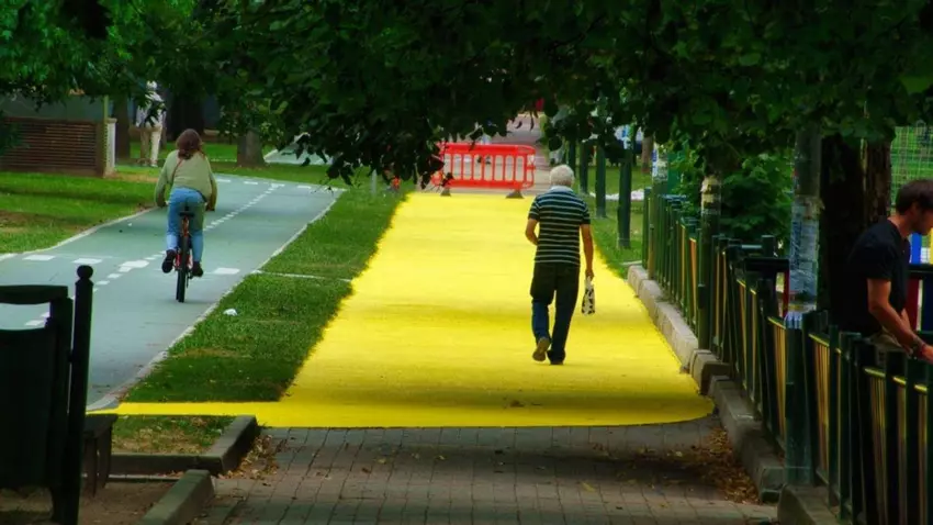 El bulevar de Coia lucía ayer de un amarillo intenso que llamó poderosamente la atención a los vecinos, como si fuera el camino del Mago de Oz. En realidad, se trata del proceso preparatorio para una experiencia muralista, pero en esta ocasión tomando como base el suelo, dentro del programa municipal "Vigo, Cidade de Cor", que se ha puesto en marcha por distintos puntos de la ciudad, en especial en el tapado de las medianeras de los edificios con obras de arte.