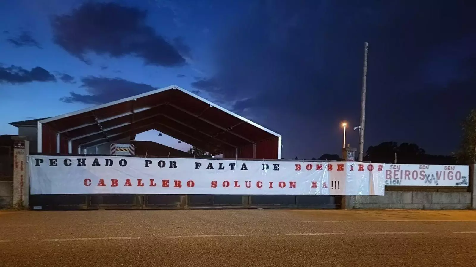El parque de Bomberos de Coruxo permanece cerrado por falta de personal. Así lo desvela una pancarta a la entrada de las instalaciones que pide una solución al Concello de Vigo.