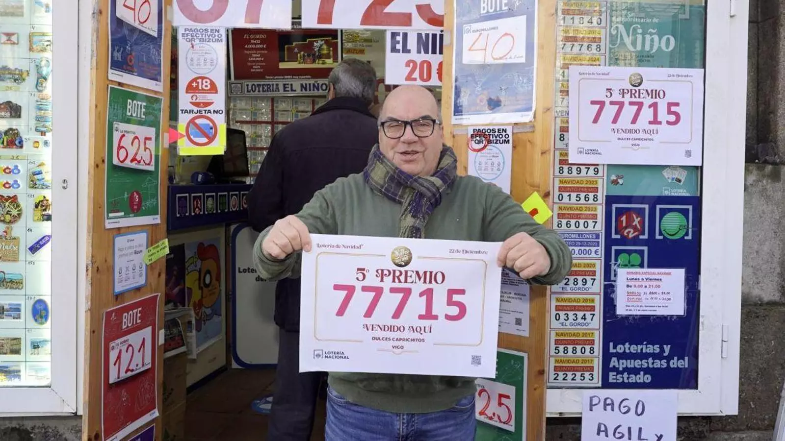 Una de las estampas más clásicas de la Navidad de Vigo son las colas para comprar Lotería en el kiosco Dulces Caprichitos. Allí, Juan Fernández presume de ser uno de los pocos vendedores que ha despachado décimos premiados con el Gordo en Vigo. Y, debido al elevadísimo volumen de ventas que tiene cada año, cada vez es más habitual que toque un ‘pellizco’ de alguno de los premios. Este año no fue una excepción y en su pequeño despacho vendió un décimo de uno de los quintos premios, el 77.715. “A muchos no les gustan los números en los que hay cifras repetidas, pero este ha traído mucha suerte”, indicaba a la prensa poco después de recibir la noticia.