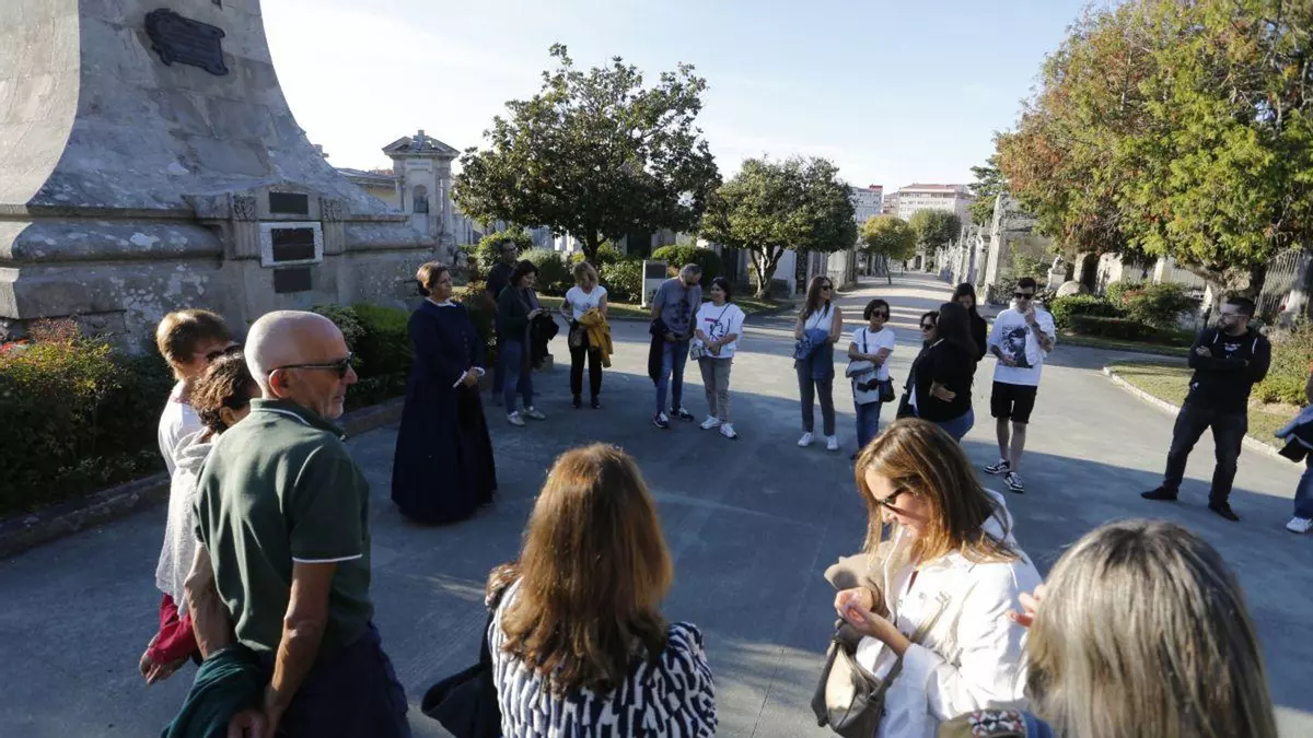 Llega el otoño y Pereiró retoma las visitas guiadas. Ayer inauguró temporada con tres grupos que por primera vez coincidieron simultáneamente en el cementerio para permitir una mayor participación. A las 18:30 horas cerró como cada día las puertas del camposanto y a los pocos minutos, dispuesta a iniciar el recorrido, Concepción Arenal hizo su aparición junto a su mausoleo, que da la bienvenida al parque funerario. Con un intervalo de media hora daban comienzo los dos turnos siguientes para un itinerario de 90 minutos.