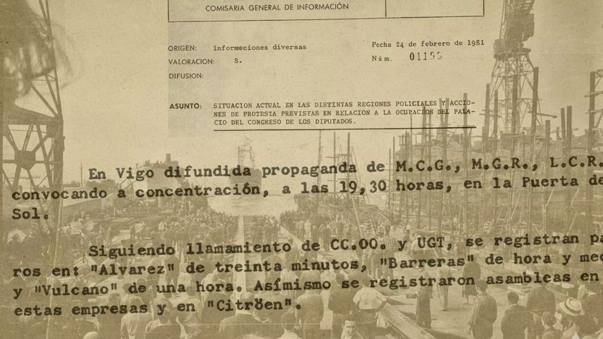 Los documentos desclasificados del intento de golpe de Estado del 23 de febrero de 1981 revelan que la sociedad viguesa no permaneció inmóvil ante los hechos y que hubo reacción tanto en ámbitos universitarios como obreros. En Vigo y Ferrol se registraron paros en factorías como Álvarez, Barreras, Vulcano, Astano o Bazán, así como asambleas y movilizaciones en centros de trabajo y universidades.