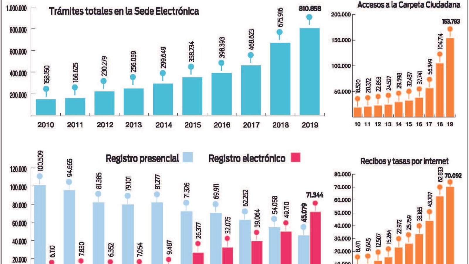 Según un informe del Concello de una década de administración electrónica, en 2019 se realizaron más de 800.000 trámites por internet, lo que supone una subida de un 20% con respecto al año anterior, el doble que en 2016 y multiplicando por 5 las cifras de 2010.