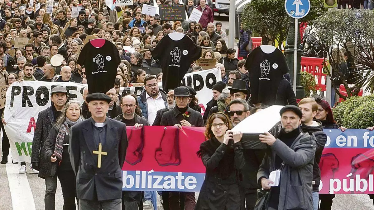 Ademais desta singular protesta, centos de docentes participaron nunha manifestación que partiu do cruce de Vía Norte con Urzaiz ata o cruce dos catro bancos. Hoxe terá lugar en Santiago a manifestación central destas dúas xornadas de folga, tamén de temática fúnebre –o enterro do ensino público–, que partirá dende o Parlamento ata a sede da Consellería de Educación.