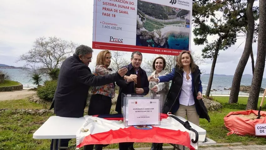 Samil inició ayer de forma oficial su transformación. Lo hizo con el acto simbólico de colocación de la primera piedra de la fase 1B de la actuación prevista en la zona, que supondrá la humanización de la avenida con la financiación del Concello y la Diputación. En estos momentos está también en fase de contratación la fase 1A, que impulsará el Gobierno para retranquear el paseo de la playa y recuperar el sistema dunar.
