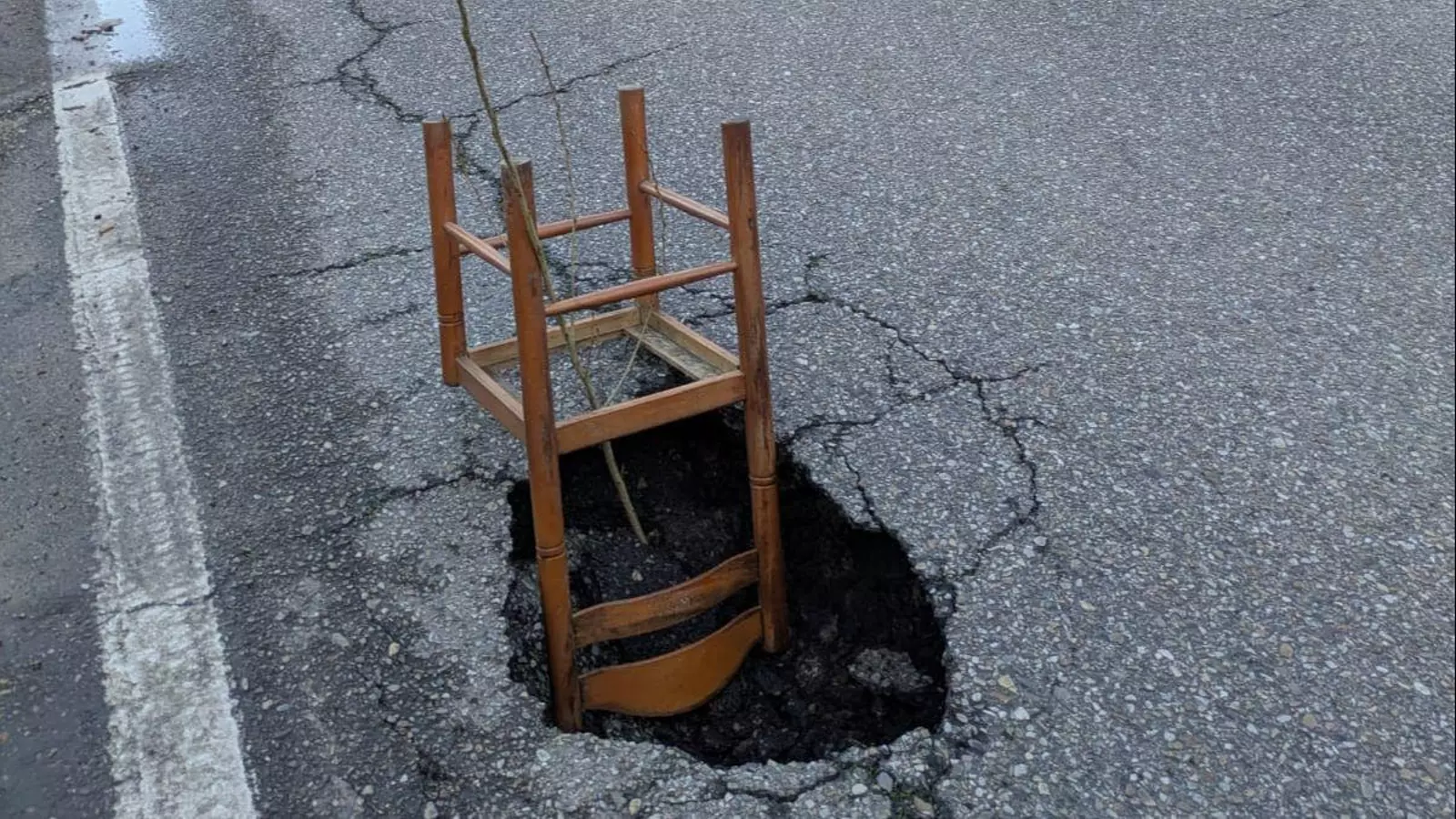 Una silla para marcar un socavón