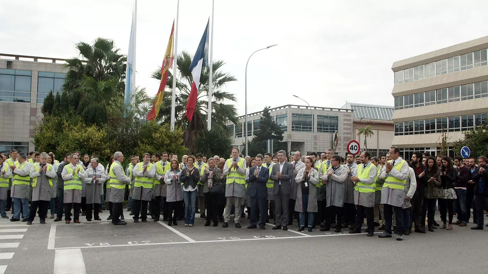 La planta de PSA Peugeot Citroën expresó en un breve comunicado "la profunda emoción tras los atentados terroristas" y se sumó a la pena de las familias de las víctimas. La delegada de Zona Franca, Teresa Egerique y el alcalde Abel Caballero, acompañado por los concejales Chus Lago y Santos Héctor, acompañaron a directiva y plantilla durante el acto de homenaje en sus instalaciones en Balaídos.