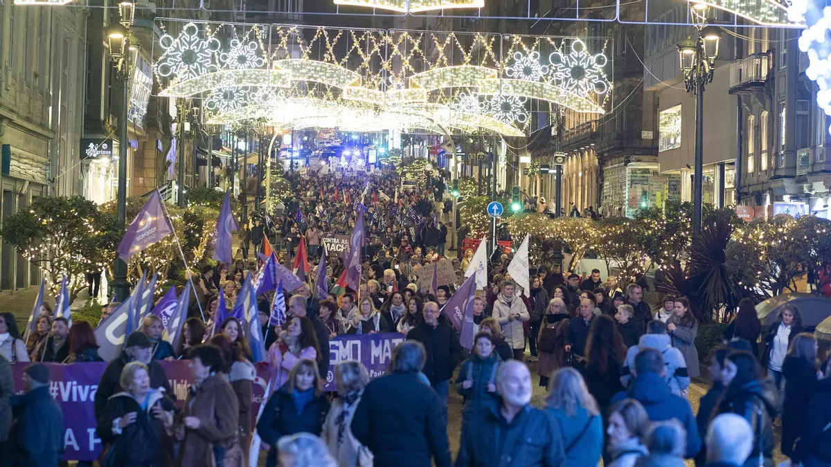 Cientos de personas se manifestaron por la tarde en Urzaiz para reclamar la erradicación de todas las formas de violencia machista y en recuerdo de las 38 mujeres asesinadas en lo que va de año en España. Se escucharon lemas como “Con roupa o sen roupa o meu corpo non se toca”, o “menos luces e máis recursos”.