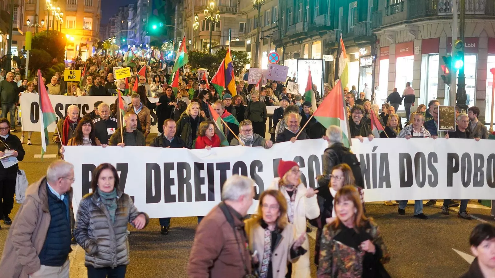 Vigo vivió este martes una multitudinaria movilización en rechazo al "imperialismo" y en defensa de los Derechos Humanos, organizada por medio centenar de colectivos, entre ellos sindicatos y formaciones de izquierda. La manifestación partió del cruce de Vía Norte y Urzáiz, encabezada por una gran bandera palestina. Los participantes corearon mensajes como "El fascismo no pasará", "No a la guerra" y "Fuera los yanquis de Irán, Palestina y América Latina".