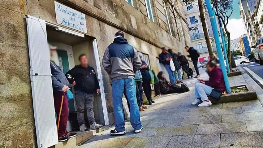 Los habitantes extranjeros en la comunidad son los más afectados por el riesgo de exclusión, aunque sus cifras mejoran paulatinamente. En 2023, la mitad de los inmigrantes con residencia en Galicia se encontraban en pobreza relativa, por debajo del 60% de los ingresos medianos a nivel nacional. Ese porcentaje fue menguando con el paso de los años: en 2015 era del 60%. Según EAPN, las políticas de inclusión social han facilitado una mejora de su calidad de vida, aunque preocupa la elevada tasa e insta a solucionarlo con urgencia, a raíz del aumento de nuevos gallegos en los últimos años.El comedor de las Misioneras del Silencio, con colas para acceder a su interior.