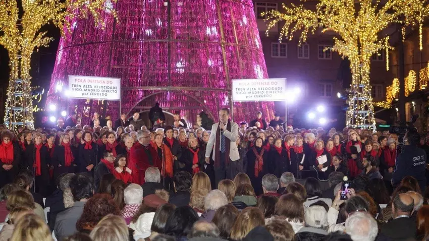 Con el árbol de Navidad gigante al fondo como testigo de lujo y en una Porta do Sol en la que apenas cabía un alfiler –fuentes municipales apuntan a una asistencia de unas cinco mil personas, intérpretes incluidos–, las piezas clásicas interpretadas por los 700 coristas aunaron la reivindicación del AVE directo por Cerdedo de los miles de vigueses que respondieron a la convocatoria del regidor en el kilómetro cero de Vigo.