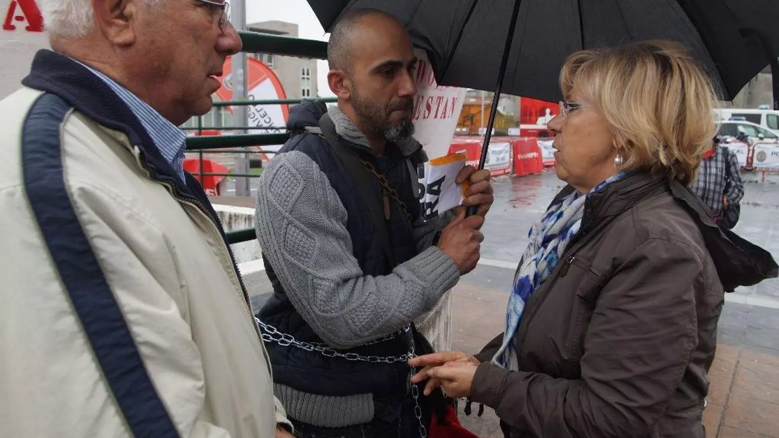 La historia de Jacobo Rodríguez presenta tintes kafkianos, los propios de quien se encuentra inmerso en un proceso que llega al absurdo y que le ha llevado a atarse a una entrada del aparcamiento de la plaza del Rey para llamar la atención. Llovía cuando contó su historia a los medios que iban pasando por allí y a la concejala de Biestar Social, Isaura Abelairas, que bajó para conocer el asunto de primera mano.