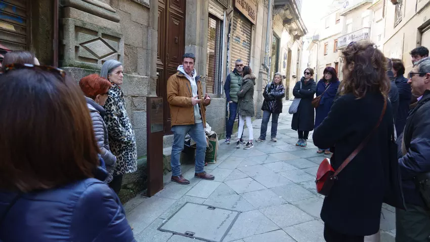 A ruta incluíu unha parada ante o lugar onde estivo a imprenta de Juan Compañel, na rúa Real. Martínez explicou que Eduardo Chao e seu irmán Alejandro presentaron a Compañel para imprimir o boletín provincial e con ese diñeiro editaron outro xornal progresista. Compañel, que coñecera a Eduardo Chao en Madrid e casara cunha das súas irmás, xa publicara obras de Rosalía e en 1863 asumiu o risco de editar “Cantares gallegos”. A tiraxe foi reducida, pero a recepción xa nese momento superou as expectativas.